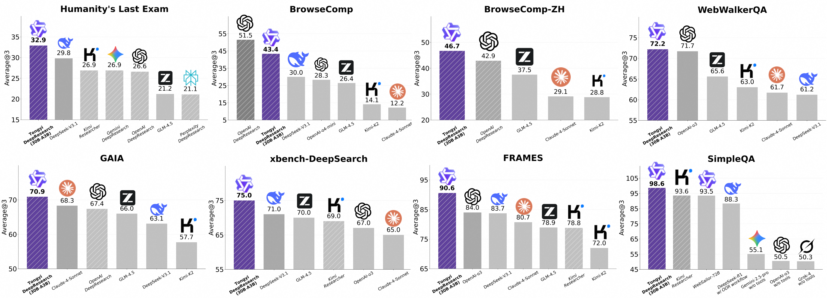 Tongyi DeepResearch, an agentic large language model featuring 30.5 billion total parameters, with only 3.3 billion activated per token. Developed by Tongyi Lab, the model is specifically designed for long-horizon, deep information-seeking tasks. Tongyi DeepResearch demonstrates state-of-the-art performance across a range of agentic search benchmarks, including Humanity's Last Exam, BrowserComp, BrowserComp-ZH, WebWalkerQA,xbench-DeepSearch, FRAMES and SimpleQA.